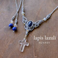 小粒サイズながらも濃い群青色の中にきらりと輝く金色の(パイライト)が内包された12月誕生石で人気のラピスラズリとブラジル産クロス水晶を組合せたマクラメ編みチョーカーネックレスです。
