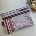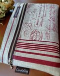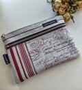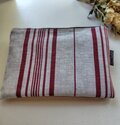 フランスのトワルドジュイ柄の生地から英字部分を切り取り、それに同じトーンの赤系ストライプ生地をはぎ合わせてまとめました。麻特有のざっくり感、ボルドー色と差し色のこげ茶色でしっとりと品よく仕上がったかと思います。