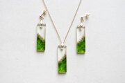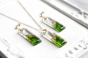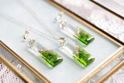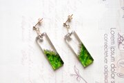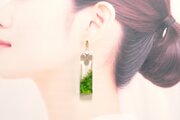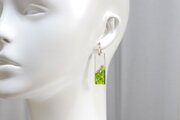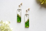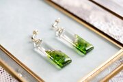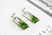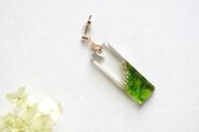長方形のレジンを数種類のグリーンで染めたピアス。