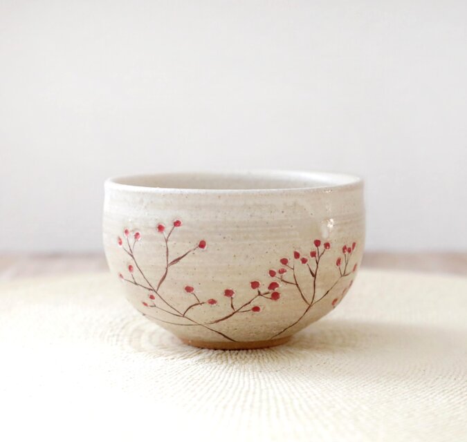 ころんと丸いお湯呑みの形に成形後、彫り模様を施し、赤く小さな丸い実が可愛らしい南天をイメージして上絵の具で彩色しました