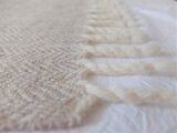 よこ糸の淡いベージュは、白色と薄茶色の羊毛をブレンドする際にあえて色を混ぜすぎず、表情のある糸になるようこだわりました。