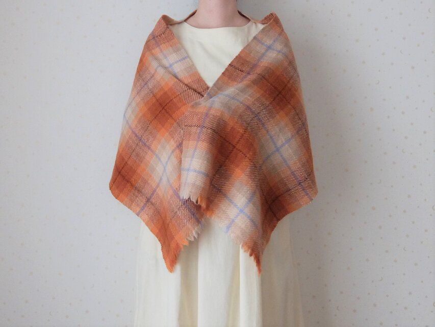ベースカラーはオレンジとテラコッタブラウン、アクセントカラーには水色を使用してチェック柄を織りました。