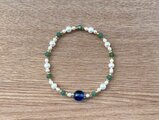 ひと粒の8mmパシフィックブルー・ヴィンテージビーズとパイングリーンクリスタルが、深みと鮮やかさを手元に添えるブレスレット。