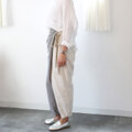 ゆるやかに落ちるシルエットはサルエル風のリラックス感を漂わせつつ、裾に向かってすっきりとまとまり、スタイリッシュな印象に仕上がります。