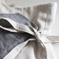 生成りのヘンプコットンとグレー系ストライプリネンを大胆に切り替えたバイカラーデザインは、シンプルながらも他にはない存在感を放ちます。