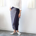 ゆるやかに落ちるシルエットはサルエル風のリラックス感を漂わせつつ、裾に向かってすっきりとまとまり、スタイリッシュな印象に仕上がります。