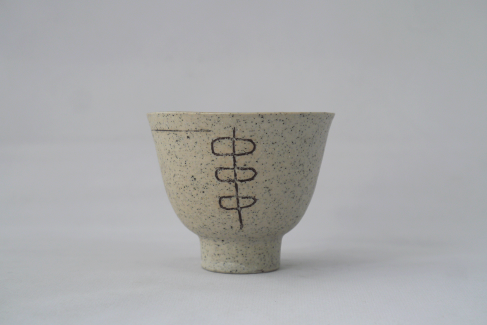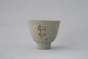 象形文字のようなイラストが前後に入った小ぶりなカップ.