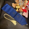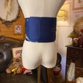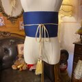 深い群青(瑠璃紺)の名古屋帯を帯ベルトに。レモン〜山吹の輪花に青緑の葉を配した花文刺繍。群青×イエローのコントラストで顔色まで冴え、巻くだけで和モードに格上げします。