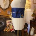 【名古屋帯 リメイク サッシュベルト 飾り帯 和洋折衷 ハンドメイド レトロ 古着 L〜LL対応 深い群青(瑠璃紺)にレモン〜山吹の輪花に青緑の葉を配した花文刺繍 ROB-132】
