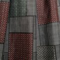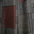地はグレー系、所々の長方形の中には赤、緑、淡い黄色で細かな菱柄などが入っています。