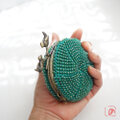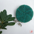 緑色の編み地に小鳥のつまみの口金を合わせました。