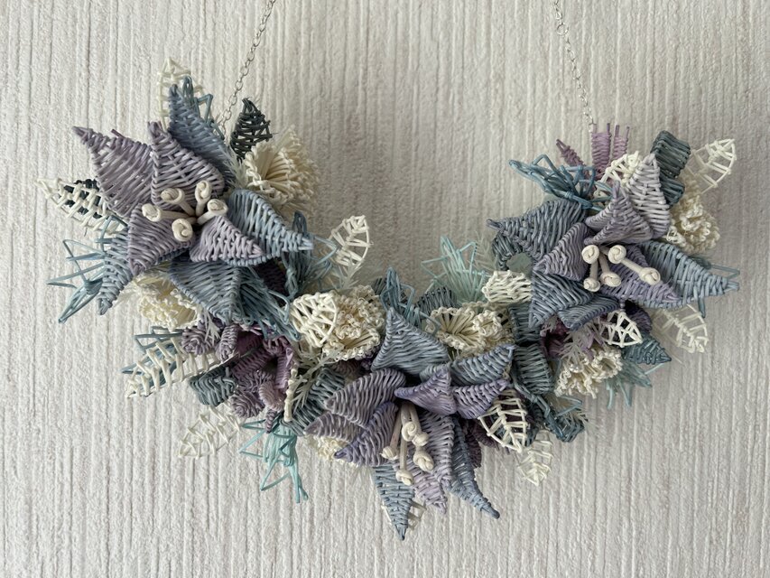 籐で編んだ花や葉をアレンジして飾りました。