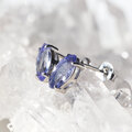 「タンザニアの石」を意味するタンザナイトは、その名が示すとおり、キリマンジャロの夕暮れ時の空を映し出したような美しい青紫色をしています。多色性という特徴を持っており、見る角度によって青色や紫色が強くなる宝石です。こちらの石でも、同時に青と紫が同時に見られます。自然光の下では透明感に満ちた美しい群青色に、夜のライトや白熱灯の下では高貴な紫色に、蛍光灯の下では青色に輝く変化も見られます。
