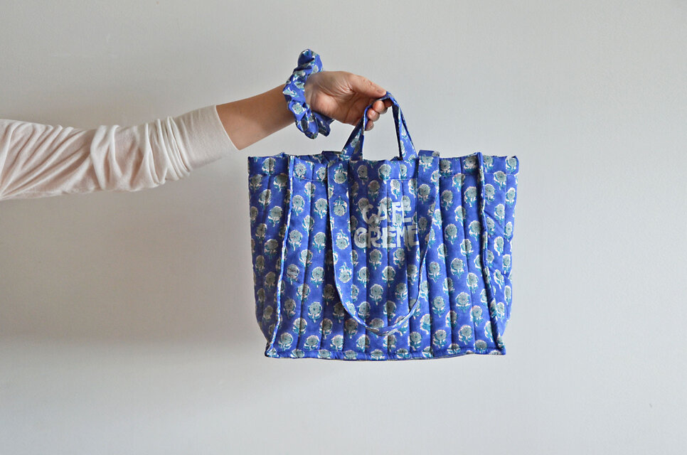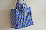 目にも鮮やかな美しい色彩、繊細ながら温もりと素朴さを感じさせるハンドブロックプリント。コットン100%素材のキルティングトートバッグはオールシーズン大活躍。