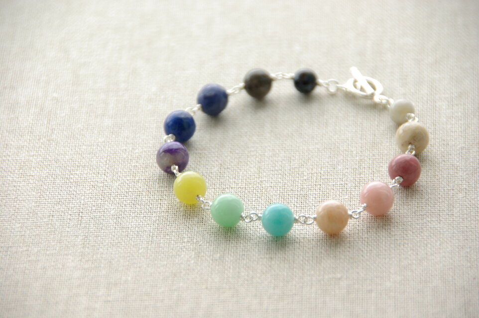 透明度が高くない石たちを集めて賑やかで心躍るブレスレットを作りました。なかには主役級とはいえない石もありますが、鮮やかな石たちに囲まれて生き生きとした表情を見せています。この作品は休養前に発表したものですが、お気に入りのひとつだったので、素材を変えて再び登場させました。石ひと粒ひと粒の美しさと、絵の具を並べたようなブレスレット全体の色彩をお楽しみください。