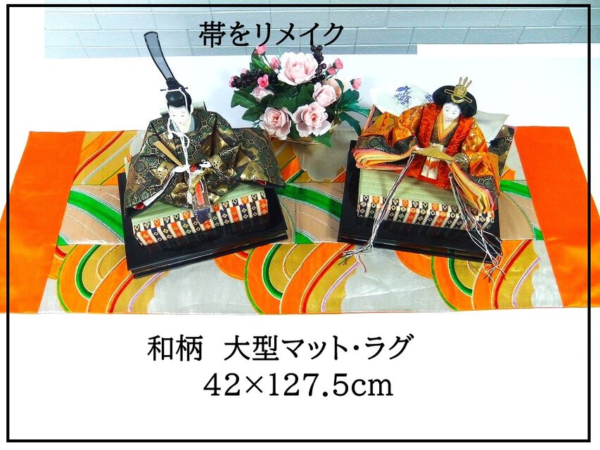 ■二種類の帯を繋いでリメイクいたしました。色鮮やかで豪華さがあるマットです。横長の大きいマットで迫力があります。