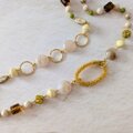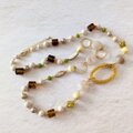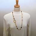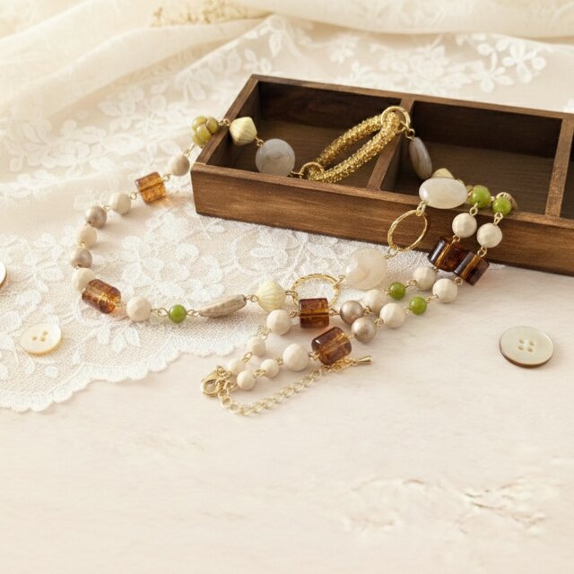 リバーストーンの柔らかなベージュ、チェコガラスの深みある輝き、そして軽やかなアクリルビーズを組み合わせたロングネックレスです。
