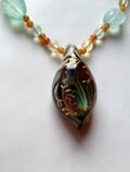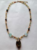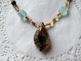 シトリン、フローライト他の石を使いネックレスを作成しています。