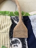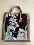 白い台布に布を好みで置いてミシンがけをしています。その布をバッグ用にカットし、マチをつけてミシンがけ。