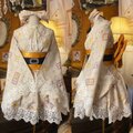 【 着物 ミニ丈 ワンピース ドレス 和ロリ 2部式作り帯 名古屋帯 リメイク 和洋折衷 洗える 化繊 ハンドメイド 古着 単衣 花紋麻の葉レース着 MKW-34 】