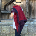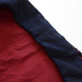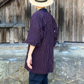 丈夫な木綿素材で仕立てられ、表地は藍染の縞模様、裏地はバーガンディのような深みのある色味で仕上げられています。