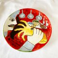 コウイカとイタリアンシェフのモチーフの絵皿です。高台に壁掛け用の穴が空いています。