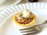 手のひらサイズのキジトラ猫さんがフェイクスイーツのタルトになりました。こんがりタルトとチョコクリームの上で、のんびりしています。アーモンドを枕にしてお昼寝です。