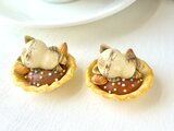 数種類の粘土を組み合わせて、作りこみました。トッピングのアラザンやクリーム、アーモンドも粘土で表現しています。フェイクスイーツの楽しさと猫さんの癒しを両方お楽しみ頂ける作品です。