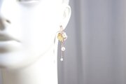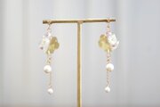 凹凸のレジンにお花とパールを封じ込め、ゴールドで装飾し、大小二粒のコットンパールをあしらったピアス。