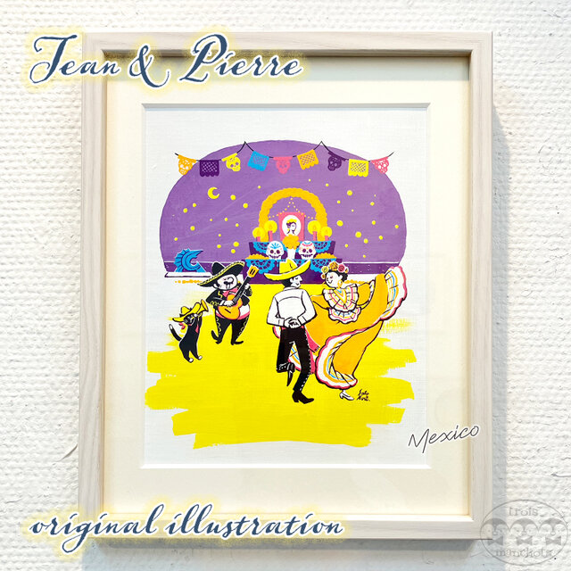 ねこのジャンと船乗りのピエールが、メキシコ ・マンサニージョで死者の日のお祭りに参加しているイラストの原画です。