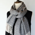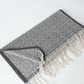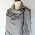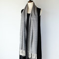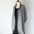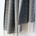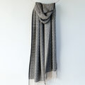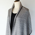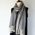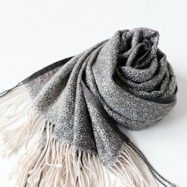 やわらかなアイボリーを経糸に、ミドルトーンのグレーを緯糸に、細やかで複雑な柄を織り出しました。日本の伝統色では鈍色に近いとても綺麗な色合いです。表と裏で織柄と色の出方が変わるので、纏い方でいろいろな表情を楽しんでいただけます。ふっくら柔らかくとても温かいので、春や秋はトップスやコートの代わりに、冬には首元に小さく巻いてマフラーのような纏い方がおすすめです。シルク混なので上品な光沢と華やかさがあり、フォーマルな場にもお使いいただけます。