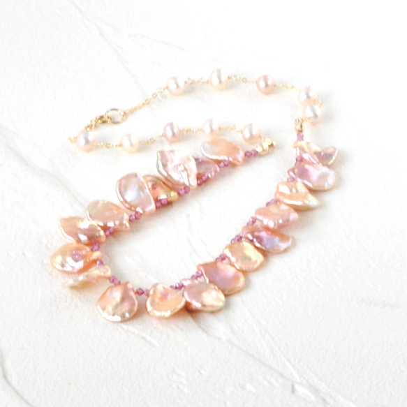 淡水真珠の中でも希少な「花びらケシパール」を贅沢に連ね、やわらかに光を受けて輝く、ラグジュアリー&エレガントネックレス。
