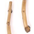 カーブする枝の流木、細い方からだんだん太くなり、太い方の先端は、握りこぶしのように丸まっており、そこには複数の木の節が集合しています。