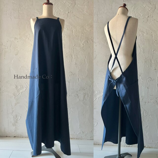 背中で紐をクロスして、通し口に紐を通しそれぞれで結び止めをつくって被るだけのスタイルや リボン結びすることもできます。