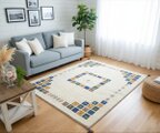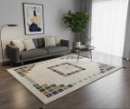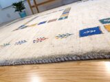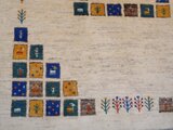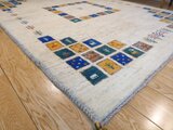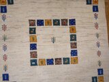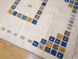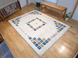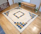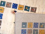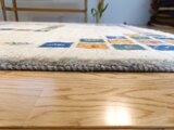 こちらのギャッベは、温かみのあるベージュを基調に、カラフルなパネルが散りばめられた、まさに一点ものの芸術品。
