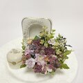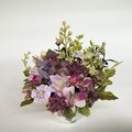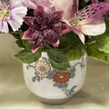 ◇アーティフィシャルフラワーで、白地に菊の花の絵付けの陶器の花器にアレンジしました、ミニサイズの仏花です