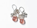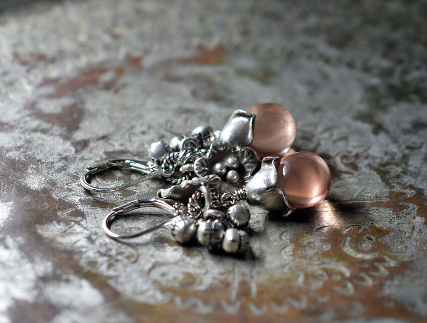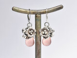 サーモンピンクウエディングビーズとお花カレンシルバーと、たわわな小さな鈴を繋いだピアスです。