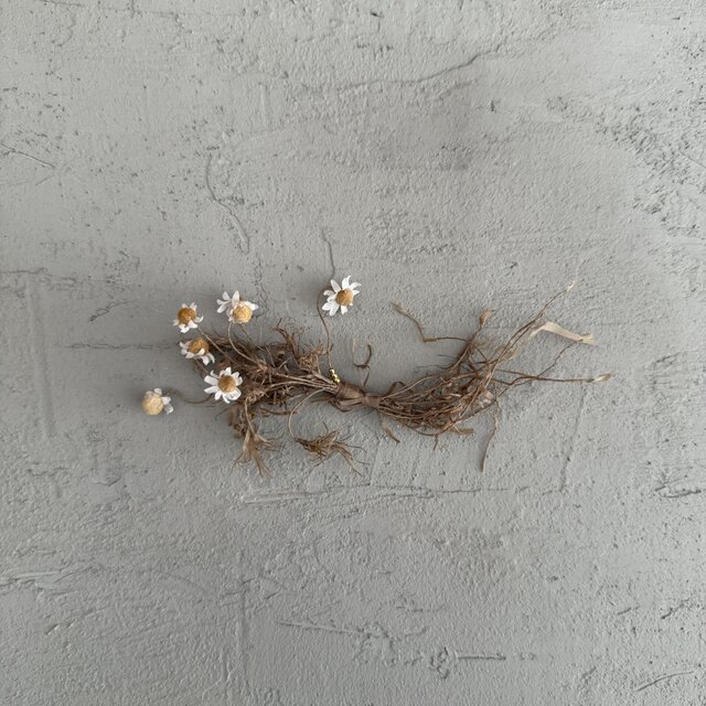 ドライフラワーのような風合いをまとったカモミールのコサージュ。全体をベージュ色で仕立て、自然で素朴な可憐さを映しました。
