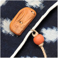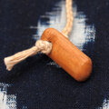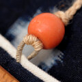 かぶせを留めつける紐に通したのは200年以上前のとんぼ玉。