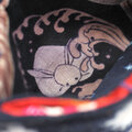 前ポケットには、玩具尽くしの柄の赤い絹布を。