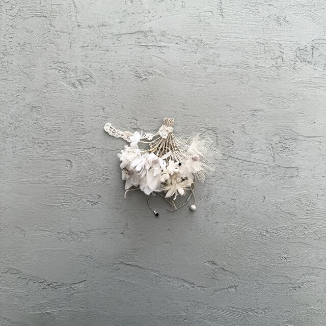ひらりと揺れる手編みレースが軽やかなリズムを添え、ふわり柔らかな印象のコサージュです。