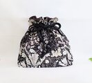 ウイリアム モリスのコンプトン柄ブラック地にアイボリーとベージュの花柄、落ち着いた色合いの綿シーチング生地の巾着袋です。