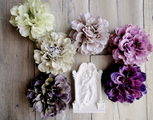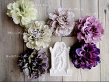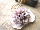 上品なラベンダー色がクリーム色と混ざり合って、まろやかでより朗らかな印象に仕上がっています。ニュアンスカラー、より自然な色あいが美しいです。ふんわりシルエットのダリアをシンプルなコサージュに。