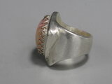 リングのサイズは12.5号、重さは18g、最大幅は25mm、手のひら側は8mm、金属部分は純銀です。