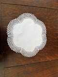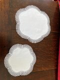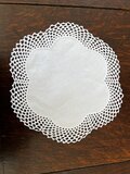 梅の花形の白い綿ドイリーです。周囲を白糸でぐるりと6段のレース編みを施し、シンプルで愛らしいドイリー。どのような花器やオブジェに敷いても素敵です!