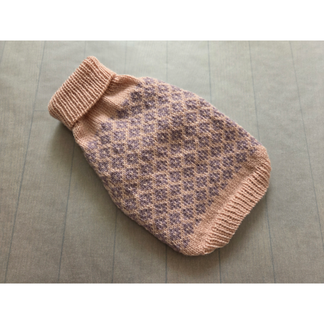 洗濯機で丸洗い可能な毛糸を使用した、小型犬用編み込みセーターです。