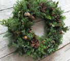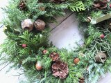 香り高い針葉樹とオークの葉を束ね一つ一つリースベースにワイヤーで付け