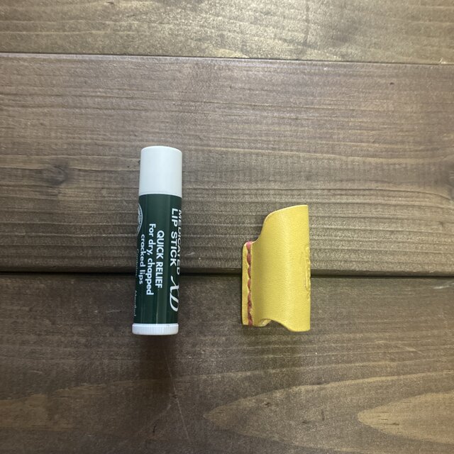 素材には張りのある黄色の姫路レザーを使用しておりピンク色の糸で仕上げたリップクリーム専用のカバー。(写真と同サイズのリップクリームに対応しています)