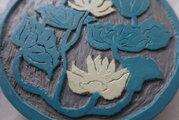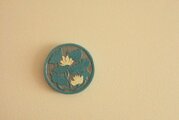 ハンドクラフトの木彫りレリーフ。手のひらサイズで、置物としても、金具をつけて壁にかけても、実用的に鍋敷や花瓶コースターとしても使えます。アクリル絵の具で色付けをし、ニスで仕上げています。