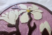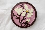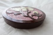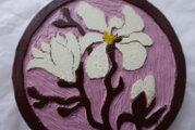 ハンドクラフトの木彫りレリーフ。手のひらサイズで、置物としても、金具をつけて壁にかけても、実用的に鍋敷や花瓶コースターとしても使えます。アクリル絵の具で色付けをし、ニスで仕上げています。